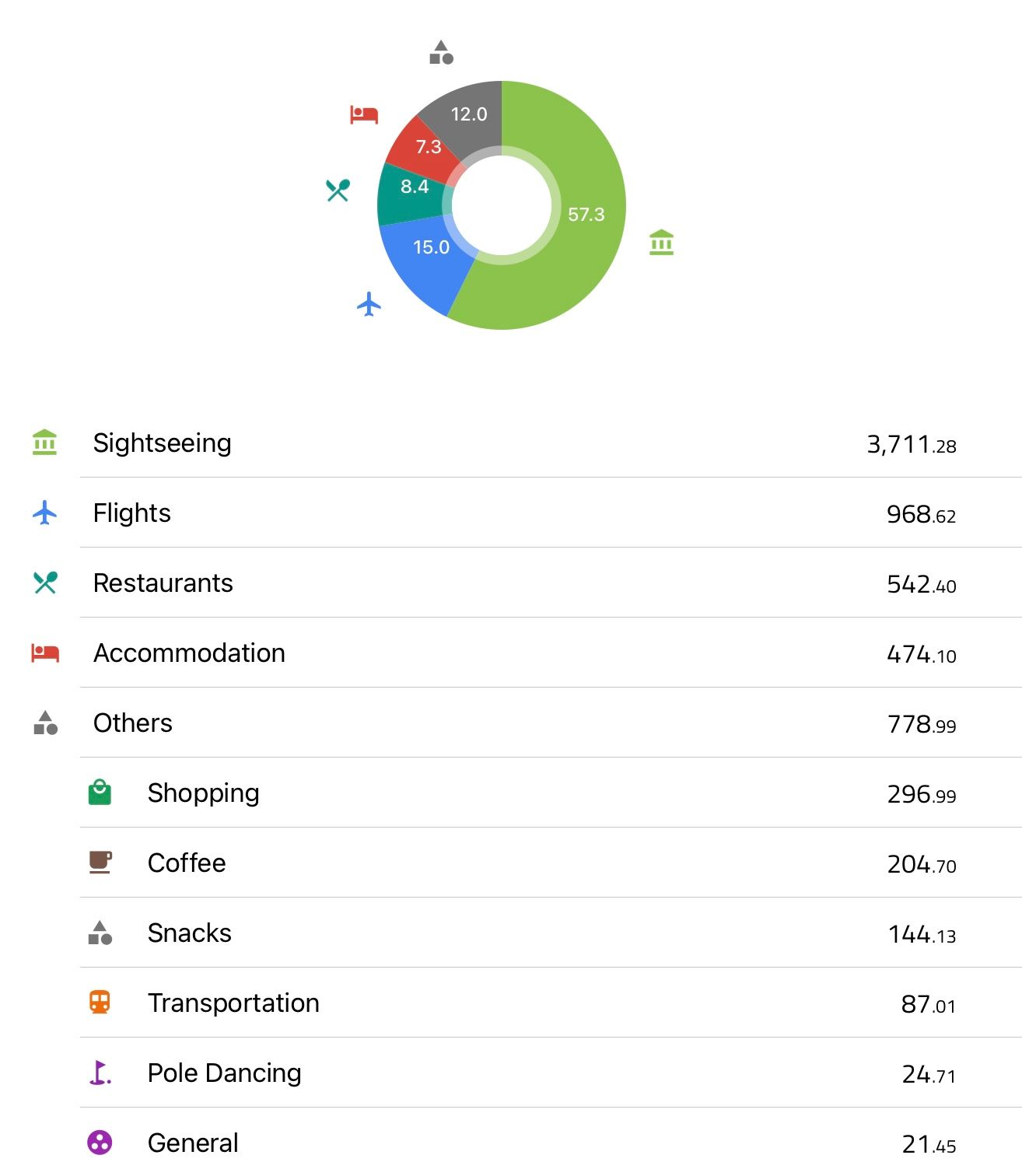 The 'Sightseeing' item is massive here because it includes an organised tour for two people for 9 days through Peru. So it includes almost all of our accomodation and transportation.